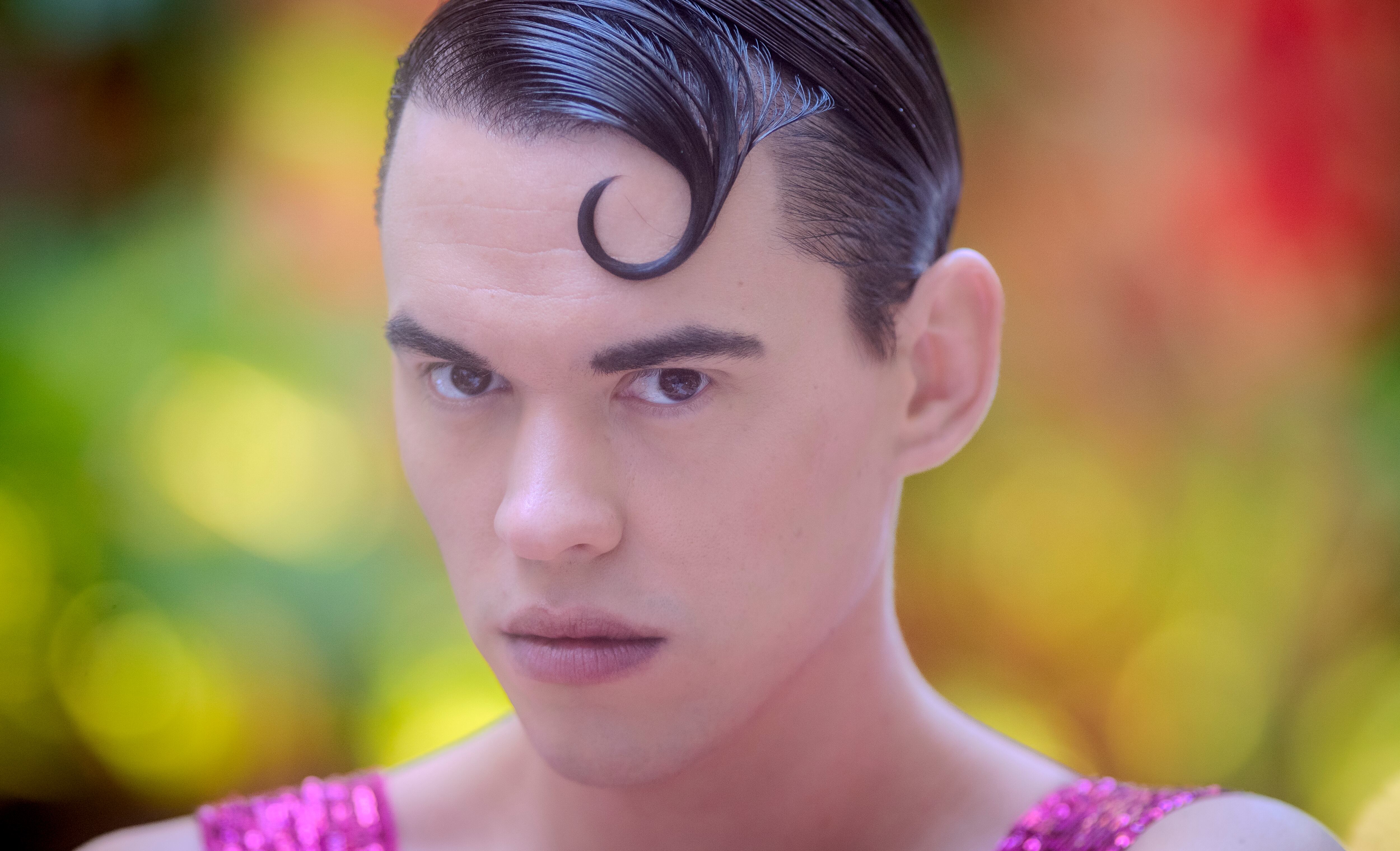 Perea es joven, sí, pero todavía lo parece más que en las fotos. Y con más aplomo. Se presenta a la entrevista y a la sesión fotográfica vestido con un ajustadísimo peto de lentejuelas fucsia —lo tiene en todos los colores, cual imagen de marca— sobre lampiño pecho descubierto y posa con absoluta naturalidad haciendo que cose un tul azul eléctrico en la terraza de un hotel rabiosamente urbano sobre los tejados del centro de Madrid. Es viejo conocido de la casa. Aquí presentó su colección durante el Orgullo LGTBI+ y agotó todos los modelos entre el público asistente. Ese es su método de trabajo: traje cortado, traje cosido, traje vendido. No es que se haya impuesto coser a destajo, dice, es que no puede evitarlo. Dejemos que se explique.