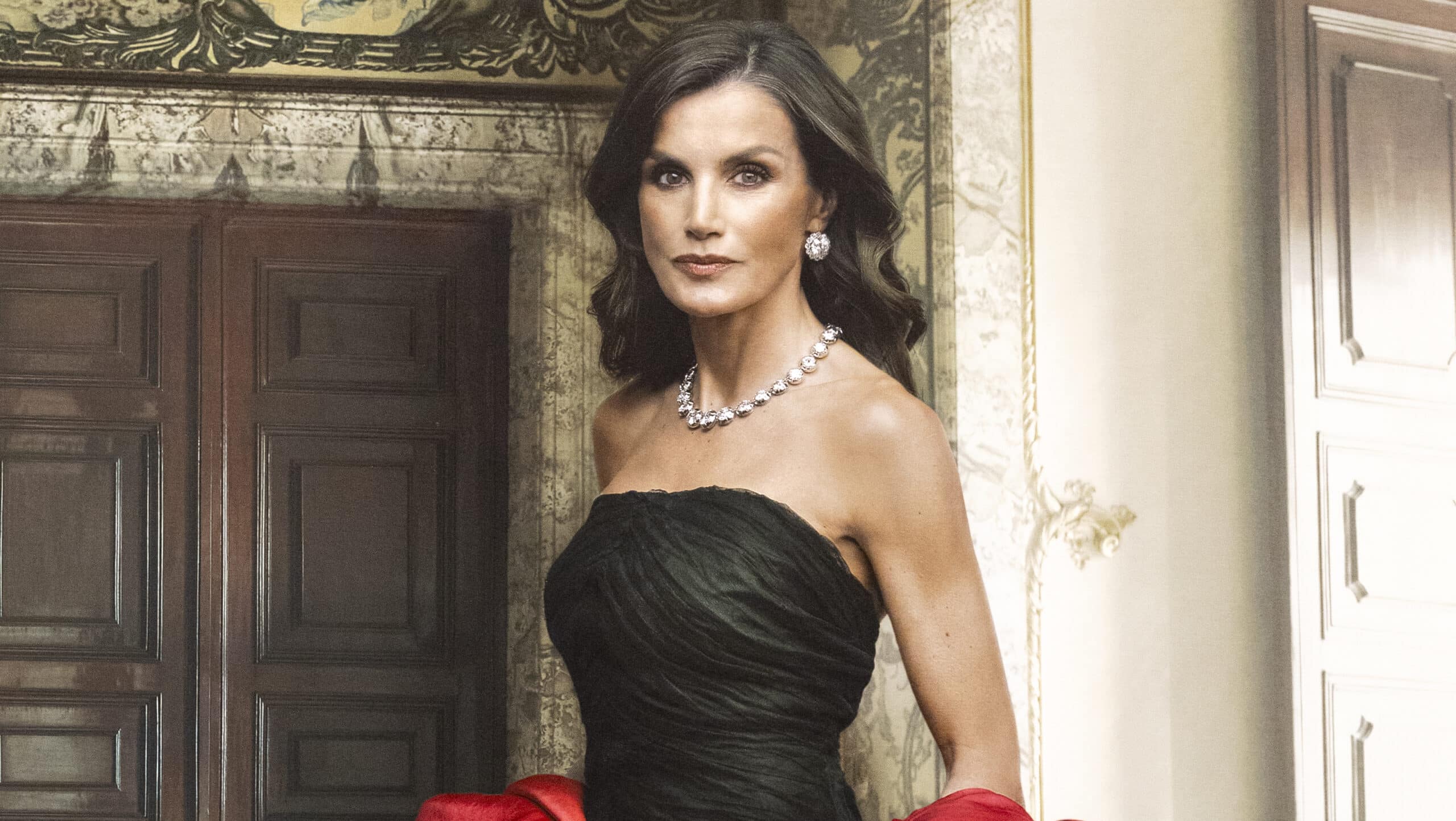 La Reina posa en otro ángulo de la Saleta, con el pelo ondulado y luciendo un collar y unos pendientes que pertenecieron a la reina Victoria Eugenia. Pero sin duda lo que más llama la atención es su vestido firmado por Cristóbal Balenciaga, que pertenece a los fondos de la Colección Textil Antoni de Montpalau. El abrigo de color rojo que Letizia luce a modo de capa fue llevado en su día, por Carme Ferrer-Cajigal, condesa de Torroella de Montgrí y marquesa de Robert, quien lo encargó a Balenciaga en 1962 para lucirlo en la boda de los príncipes Juan Carlos y Sofía.