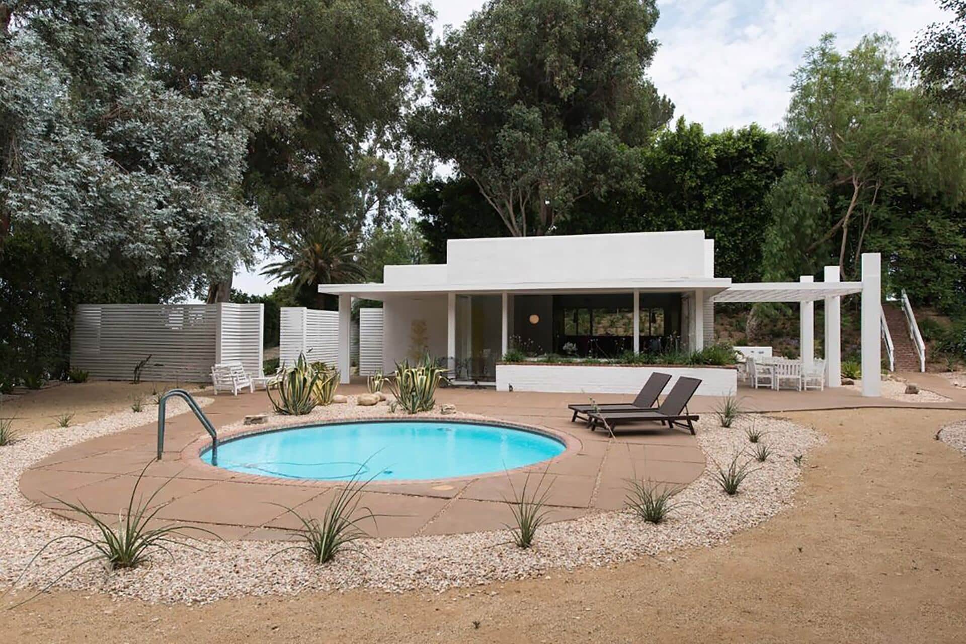 La mansión, a la sombra de árboles centenarios, es un edificio de pulcra estética futurista con más de 600 metros cuadrados habitables, cuatro dormitorios, siete cuartos de baño y paredes de cristal móviles. La diseñó en 1941 el arquitecto de origen portugués William Pereira, autor de construcciones tan emblemáticas como la pirámide Transamerica de San Francisco, el Theme Building del aeropuerto internacional de Los Ángeles, la librería Geisel de San Diego, el campus de la universidad Pepperdine de Malibú o el hotel Disneyland de Anaheim.