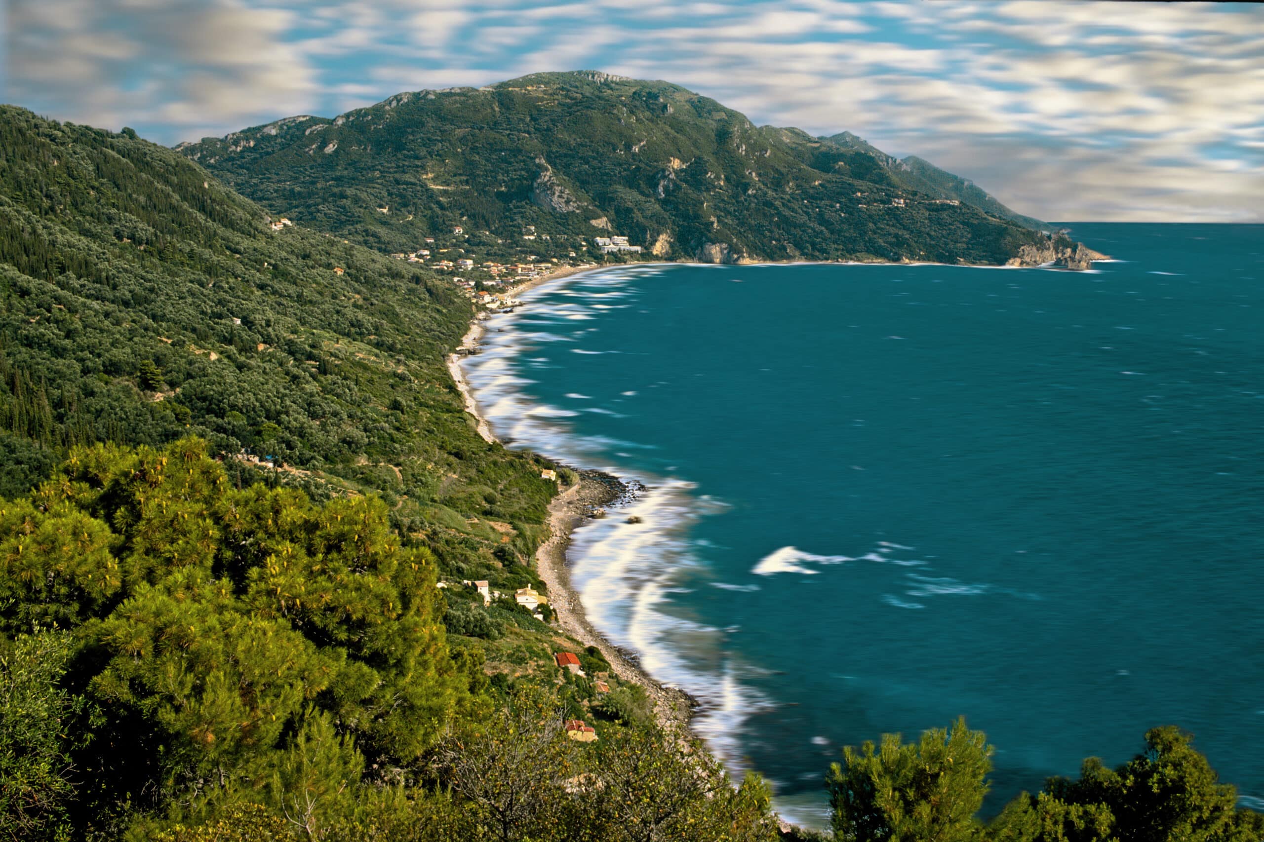 En el verde oscuro de estos montes jónicos se esconde un pasado de violentas incursiones con ánimo invasor, cuando Bizancio cayó y estas rocas mediterráneas fueron disputadas durante siglos, e incluso Mussolini pretendió hacerse con ellas, fracasando en el intento.